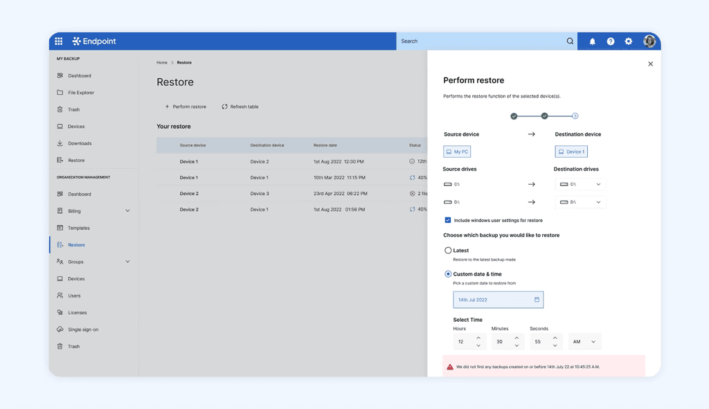Designing all key user flows (onboarding, device management, backup policies, restore workflows)